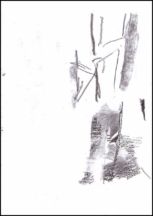 1. Sur cette feuille il y a deux dessins, celui du haut recherche une simplification, et tend vers le schéma. Or je trouve le mot « schéma » un peu dur, un peu schématique, justement. Il porte trop en lui l’idée de géométrie pour des sous-bois.