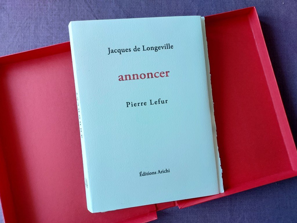 Parution de « annoncer », 0 2 décembre 20232 décembre 2023 Écrit par CHAMP un livre d’artiste illustrant cinq poèmes originaux de Jacques De Longeville par cinq encres de Chine sur papier asiatique dont une en double page.Le tout dans un emboîtage en carton entoilé réalisé à la main. Donc cent illustrations originales réparties sur vingt livres. En vente chez l’auteur, comme on dit. Pour cela passer par la page Contact. Partager : Partager sur X(ouvre dans une nouvelle fenêtre) X Partager sur Facebook(ouvre dans une nouvelle fenêtre) Facebook J’aime chargement…